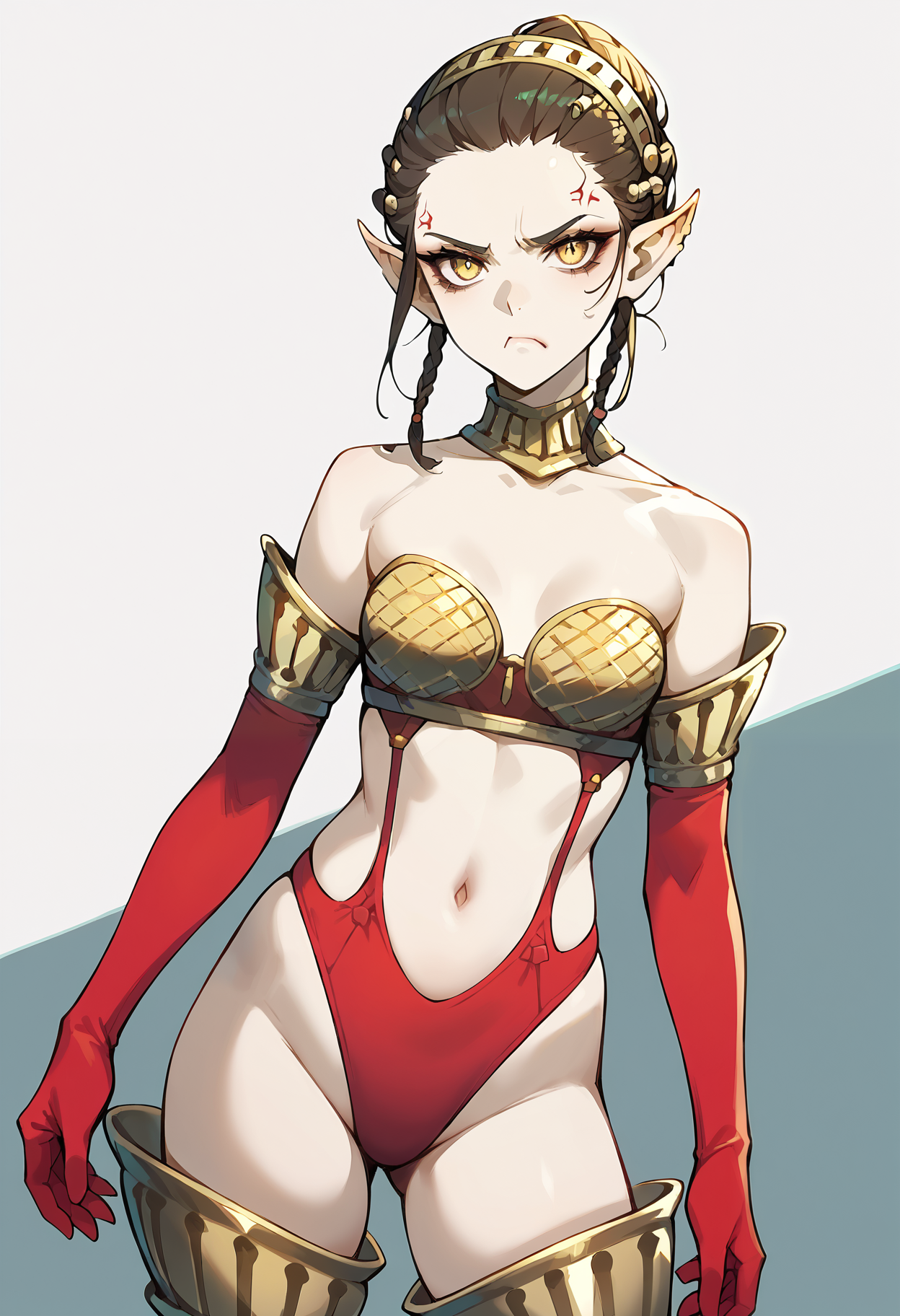 highcut-red, hairband, choker, collar, bare shoulders, red elbow gloves, navel, red thighhighs, thigh boots, gold, gold metal