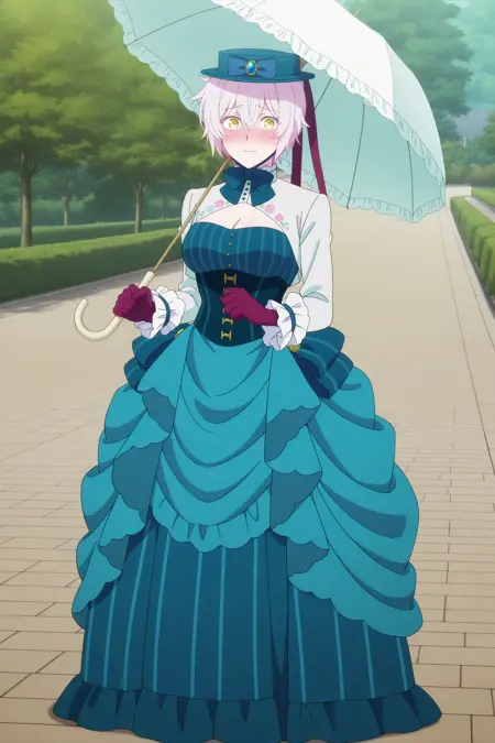jeanne, short hair, pink hair, hair between eyes, yellow eyes, aqua hat, boater hat, red hat bow, chin strap, aqua bowtie, long sleeves, white jacket, cropped jacket, cleavage cutout, purple gloves, aristocratic clothes, victorian, aqua dress, aqua skirt, long skirt