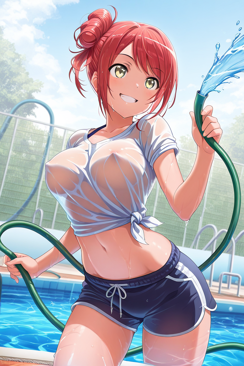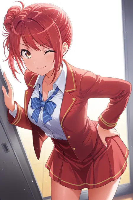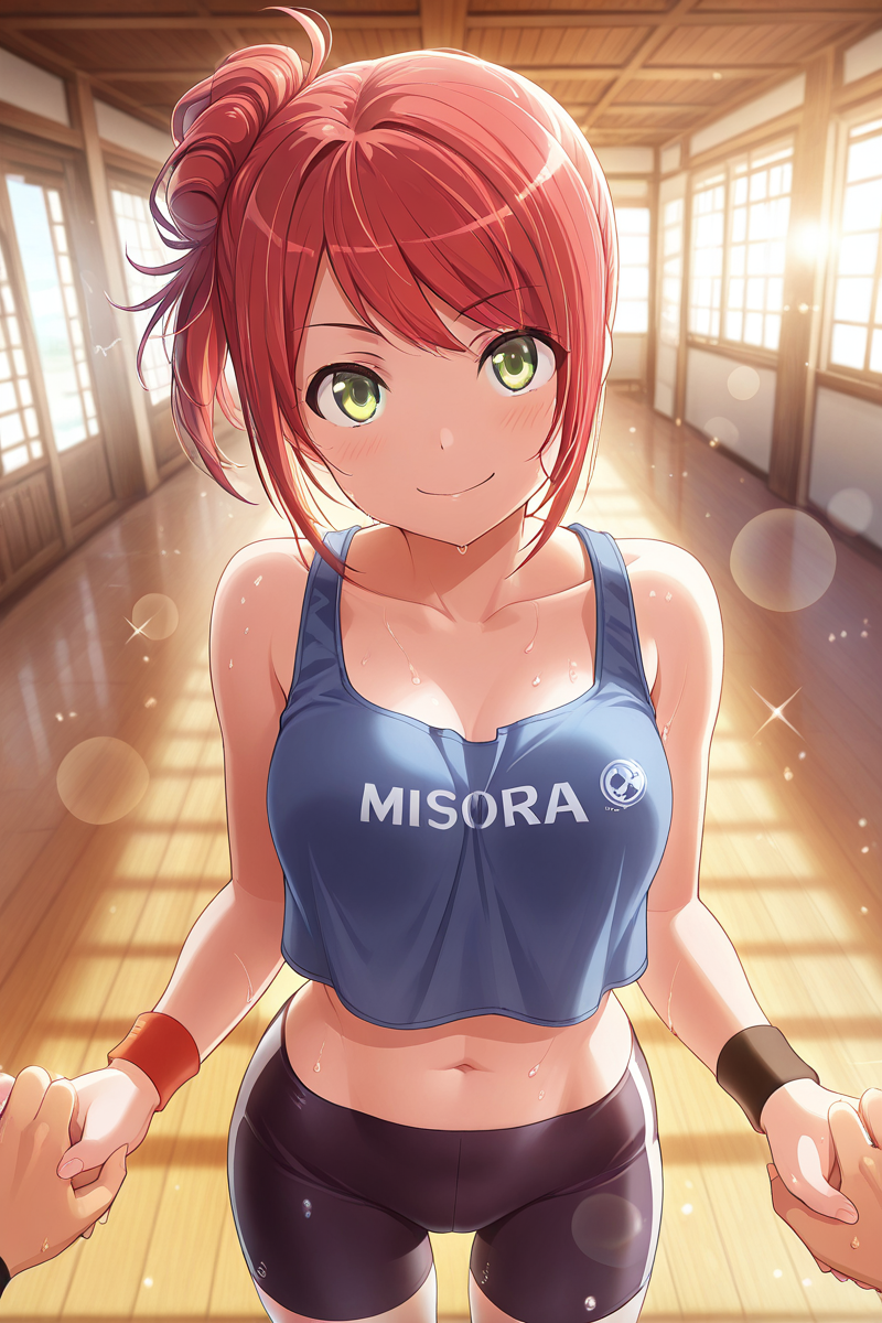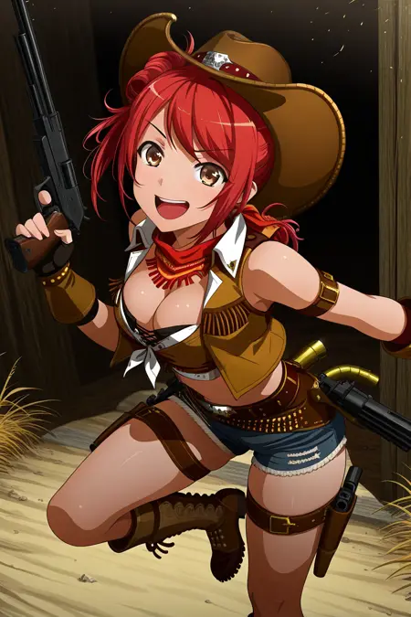 misora, 1girl, solo, gloves, red hair, fingerless gloves, skirt, yellow eyes, open mouth, smile, brown gloves, breasts, stage outfit