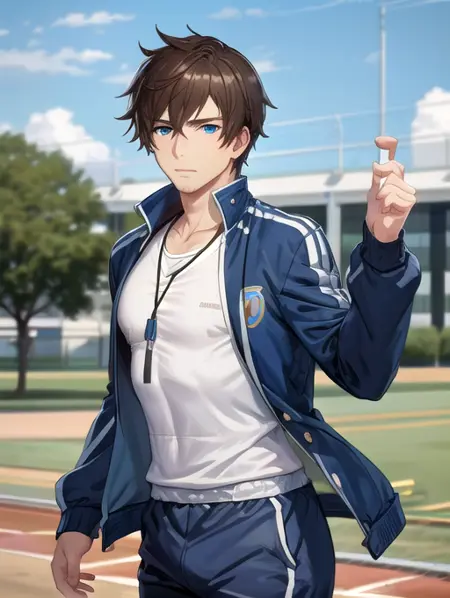 追加で役立つワード:学校、スポーツジャケット、開いたジャケット、白いシャツ、首にホイッスル、トラックパンツ