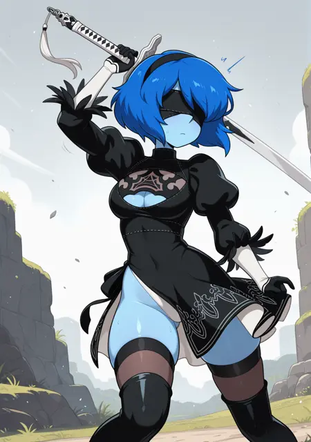 基本プロンプト: "illulapis, blue skin, blue hair, blue eyes," (背中の宝石には「gem」を追加)