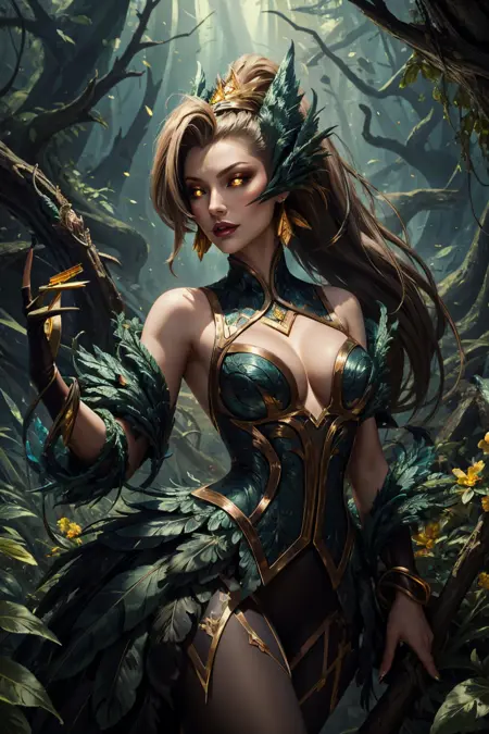 태그: coven zyra, 1girl, 드레스, 페이탈, 귀걸이, 어깨 노출, 헤어 장식, 클리브리지, 깃털, 노란 눈