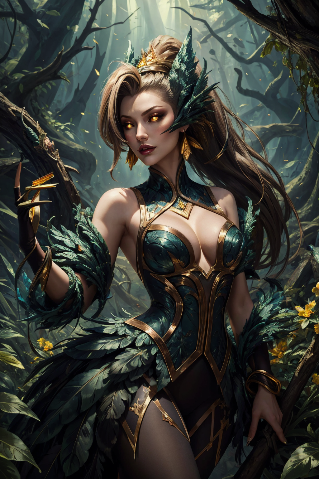 标签:coven zyra, 1girl, 连衣裙, 马尾辫, 耳环, 裸露肩膀, 发饰, 深V领, 羽毛, 黄色眼睛