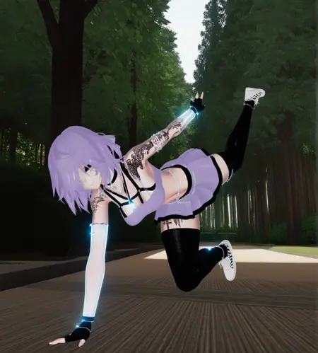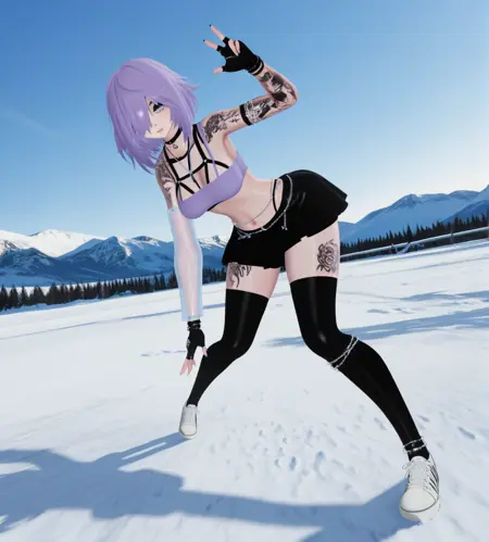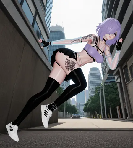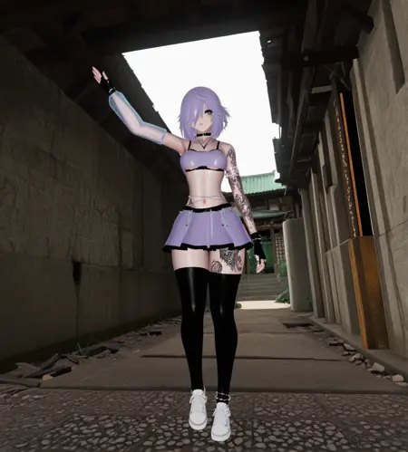 基础:maddy(原版),紫色头发,短发,头发遮住一只眼睛,灰色眼睛,鼻环,唇环,手臂纹身,纹身,腿部纹身,