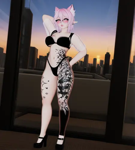 基础:刀剑(原版),粉发,短发,空洞眼神,粉眼,粉唇,刘海,腿部纹身,耳洞,纹身,肋骨纹身,尖耳,动物耳朵,
