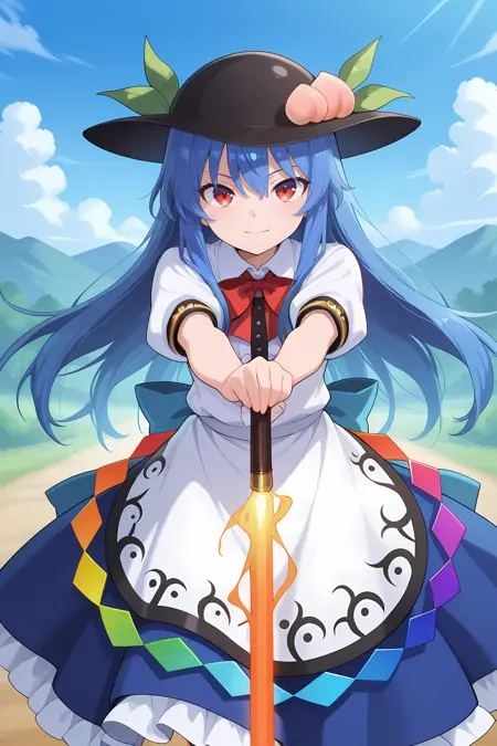 hinanawi tenshi, 1girl, solo, red eyes, blue hair, long hair,