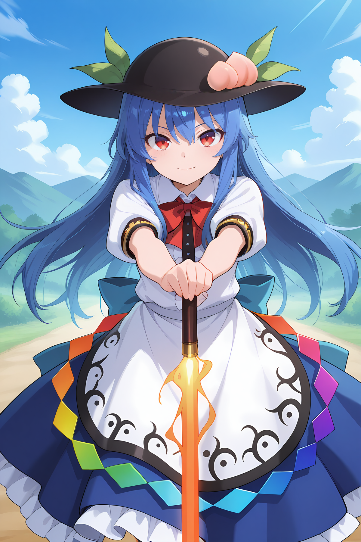 hinanawi tenshi, 1girl, solo, red eyes, blue hair, long hair, 侧发束,, hinanawi tenshi \(绯色\), 替换颜色, 黑色帽子, 迷你帽, 桃子帽饰, 红色领结, 粉色衬衫, 蓬松短袖, 中央荷叶边, 白色手镯, 白色围裙, 彩虹序列, 红色裙子, 背后蝴蝶结, 红色蝴蝶结, 棕色靴子,