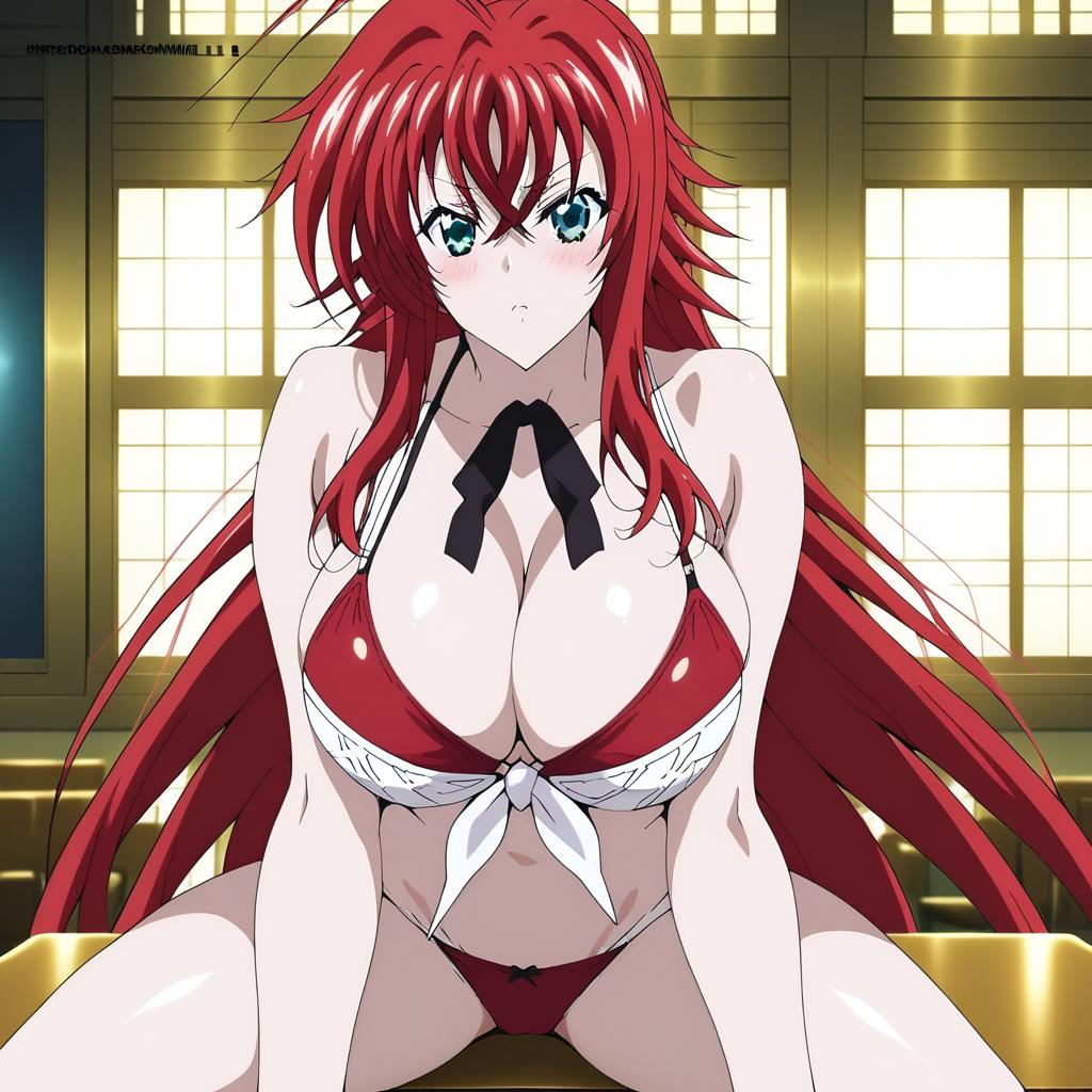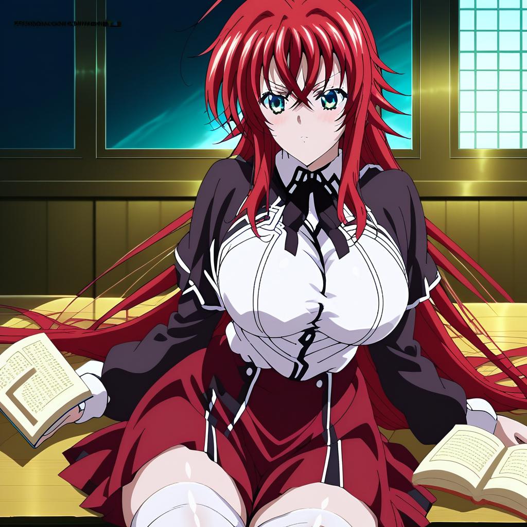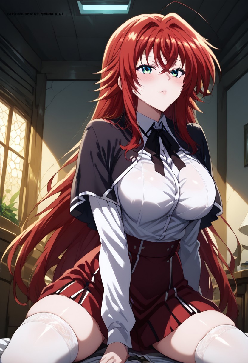 1소녀, 리아스 DxD, 빨간 머리, 긴 머리, 파란 바다 눈, 가로 단발, 큰 둥근 가슴, 젯타이 리ョ우키, 셔츠, 치마, 검정, 흰색 허벅지양말, 퍼프 소매, 학교 유니폼
