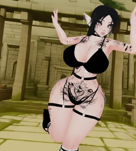 옷: 귀 피어싱, 검은 초크, 목걸이, 손가락 없음 장갑, 피시넷 장갑, 검은 브라, 검은 톤,