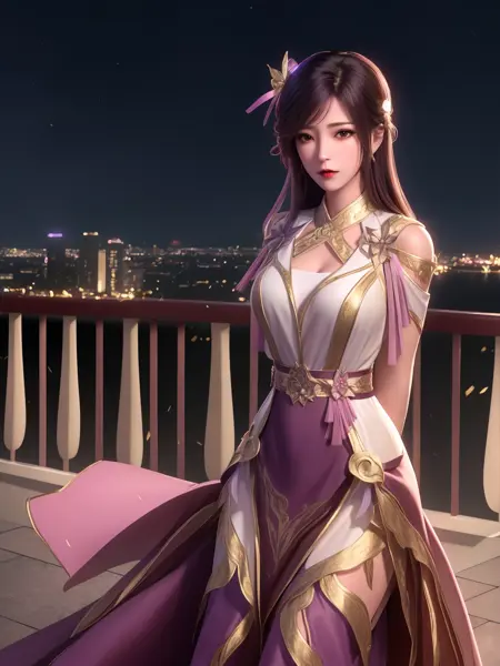 - 1girl, WMSJyunxiYR,mature female, looking at viewer, cityscape, night,hair ornament, ribbon, arms behind back, dress, cowboy shot,