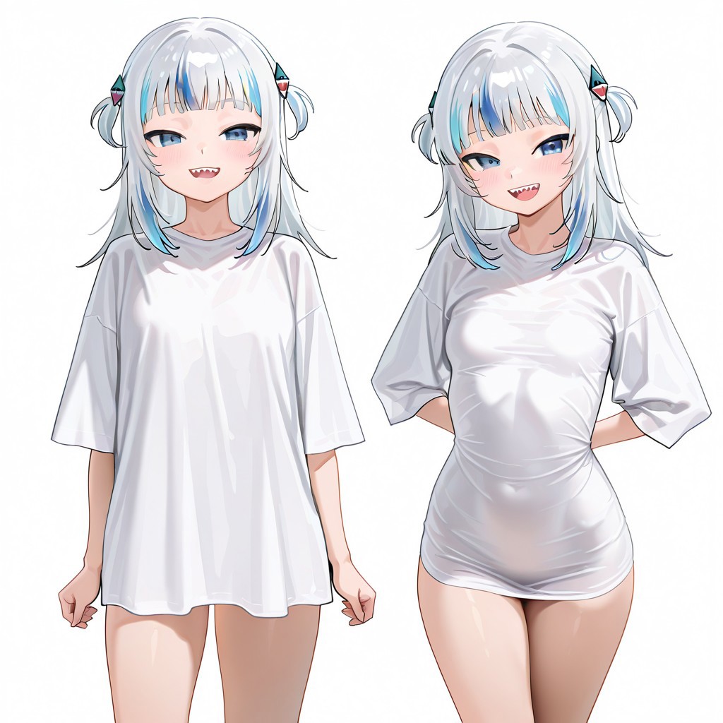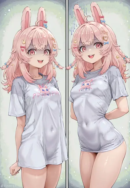 pajamasChallenge, 1girl, multiple views, shirt overhang, tight shirt, taut shirt, naked shirt, looking at viewer, open mouth, smile, arms behind back, upper teeth only, cowboy shot, no pants,