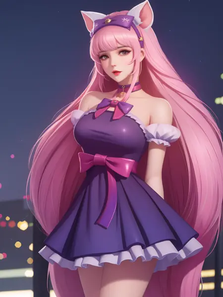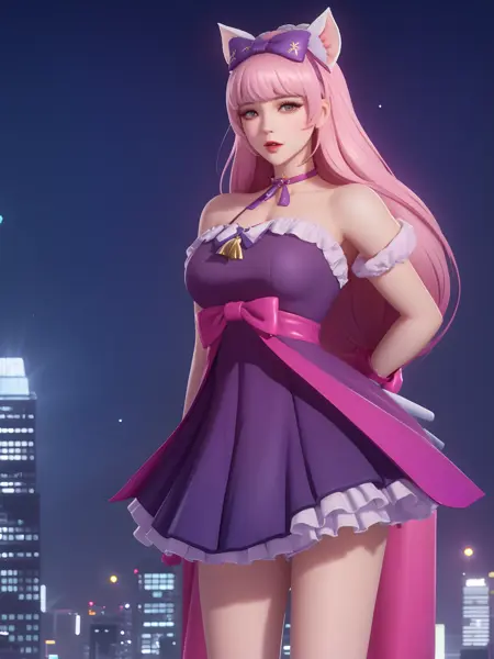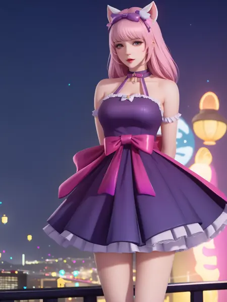 - WZRYdaqiaoMGRJ,1girl, mature female, looking at viewer, cityscape, night, bell,bow,dress,choker, arms behind back,