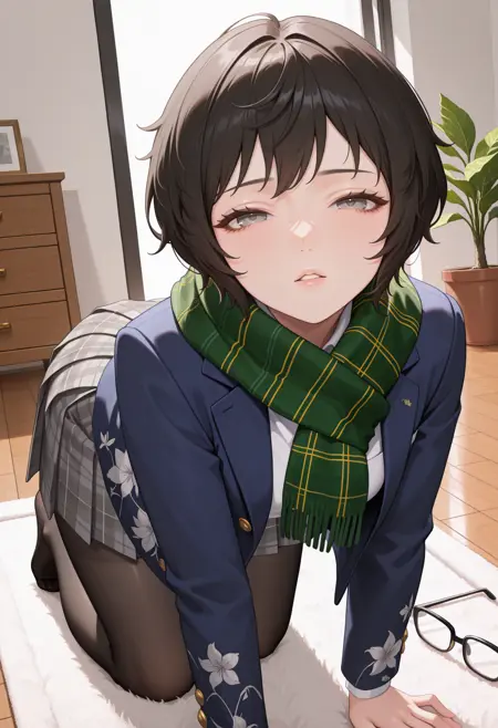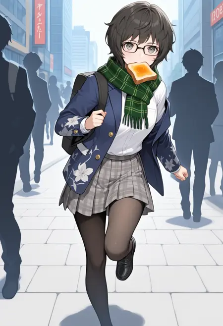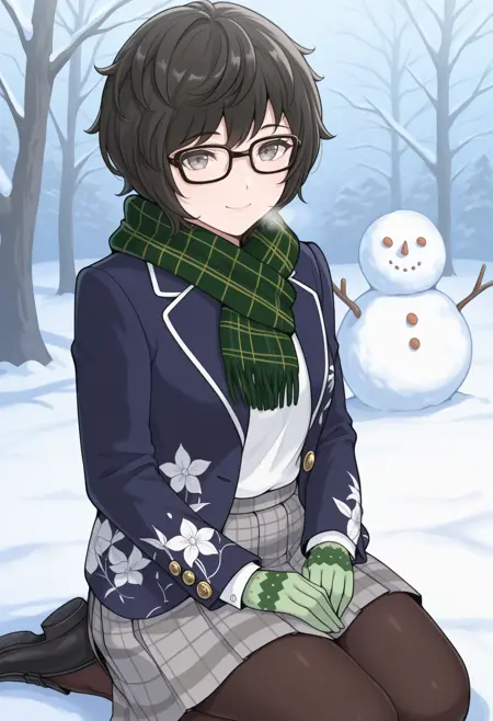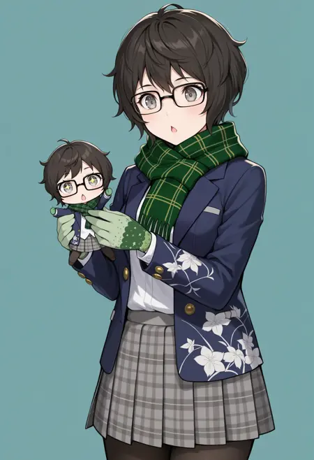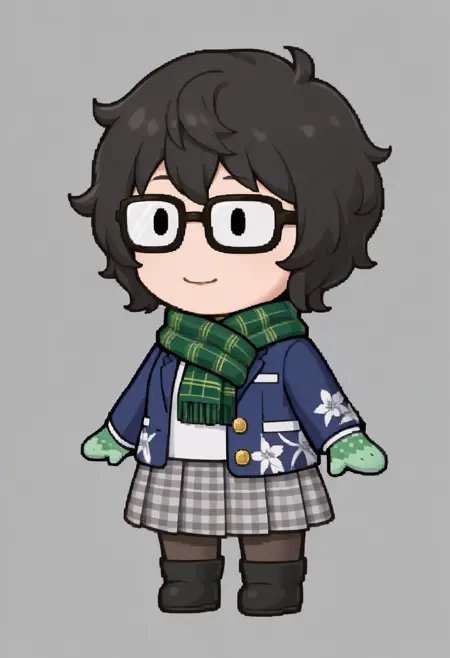デフォルトの外見: m1ya、黒髪、短髪、灰色の目、眼鏡、緑のスカーフ、チェック柄のスカーフ、制服、青いジャケット、開いたジャケット、長袖、花柄、白いシャツ、緑の手袋、縞模様の手袋、灰色のスカート、チェック柄のスカート、プリーツスカート、黒いストッキング、ローファー、黒い靴