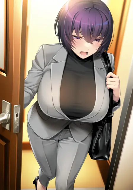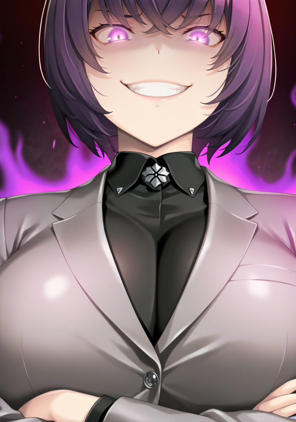 "huge breasts,short hair, purple hair, bangs,purple eyes"
