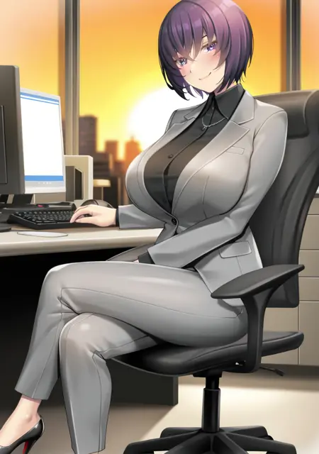 "formal, black shirt,gray jacket,grey pants,highheels"