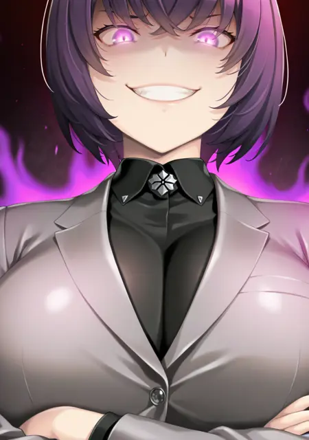 "巨大的乳房,短发,紫色头发,刘海,紫色眼睛"