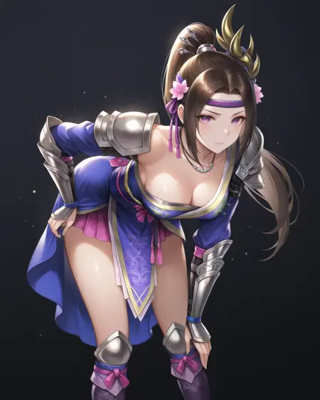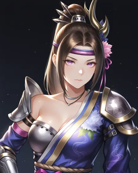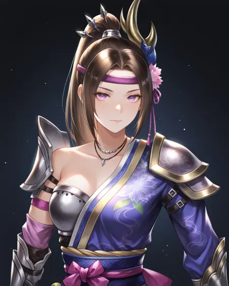 <lora:InahimeSW4_Illustrious:1>, Inahime, 진한 갈색 머리, 긴 머리, 꼬리머리, 보라색 눈, 중간 크기의 가슴, 머리띠, 머리 장신구, 목걸이, 보라색 드레스, 갑옷, 어깨 갑옷, 팔보호대, 무릎 부츠,