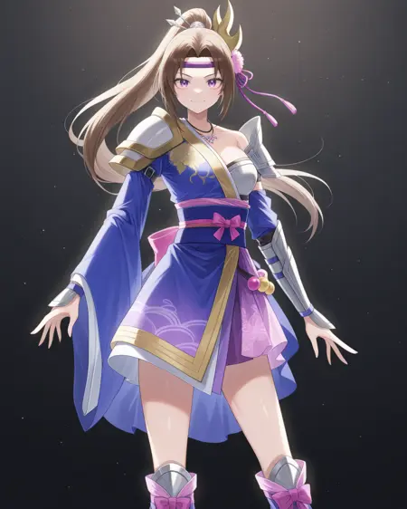 <lora:InahimeSW2_Illustrious:1>, Inahime, 진한 갈색 머리, 긴 머리, 꼬리머리, 보라색 눈, 중간 크기의 가슴, 머리띠, 머리 장신구, 구슬 목걸이, 드레스, 분홍색 띠, 갑옷, 어깨 갑옷, 팔보호대, 무릎 부츠,