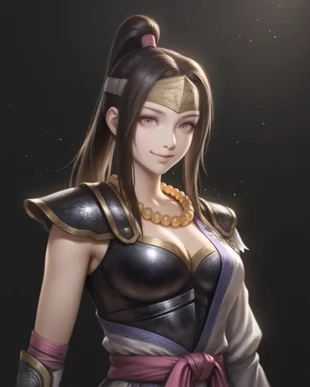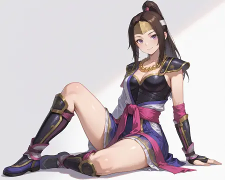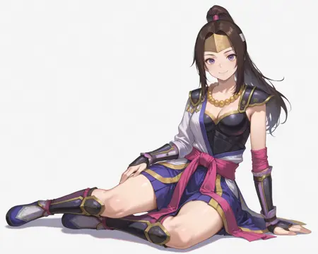 <lora:InahimeSW2_Illustrious:1>, Inahime, dark brown hair, long hair, ponytail, purple eyes, medium breasts, headband, hair ornament, bead necklace, dress, pink sash, armor, shoulder armor, vambraces, knee boots,