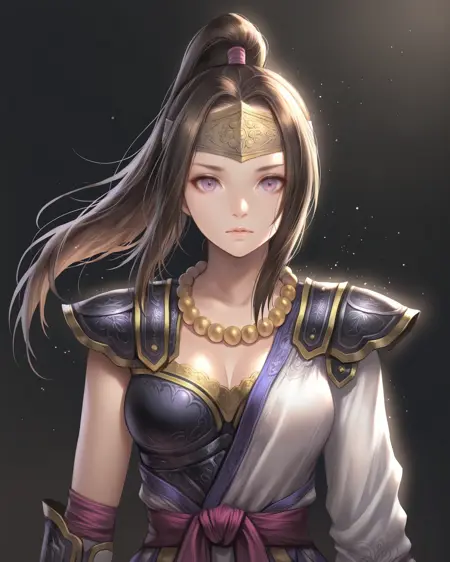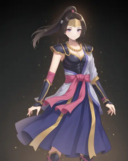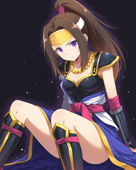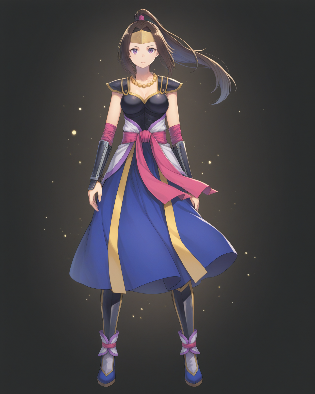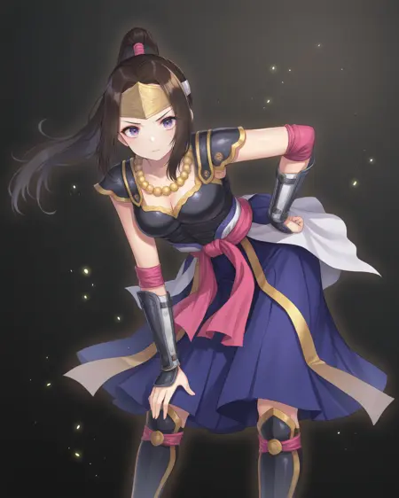 <lora:InahimeSW4_Illustrious:1>, Inahime, dark brown hair, long hair, ponytail, purple eyes, medium breasts, headband, hair ornament, necklace, purple dress, armor, shoulder armor, vambraces, knee boots,