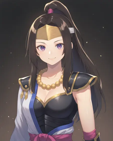 <lora:InahimeSW2_Illustrious:1>, Inahime, 濃茶色の髪、長い髪、ポニーテール、紫の目、中ぐらいの胸、ヘッドバンド、髪飾り、ビーズネックレス、ドレス、ピンクの帯、鎧、肩甲板、腕甲、膝長ブーツ、