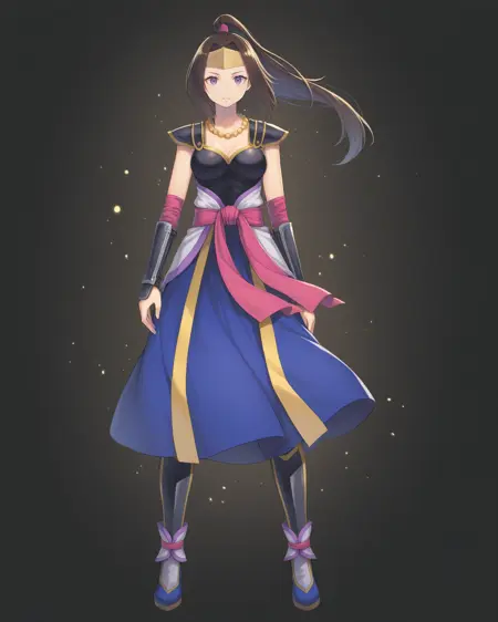<lora:InahimeSW4_Illustrious:1>, Inahime, 濃茶色の髪、長い髪、ポニーテール、紫の目、中ぐらいの胸、ヘッドバンド、髪飾り、ネックレス、紫のドレス、鎧、肩甲板、腕甲、膝長ブーツ、