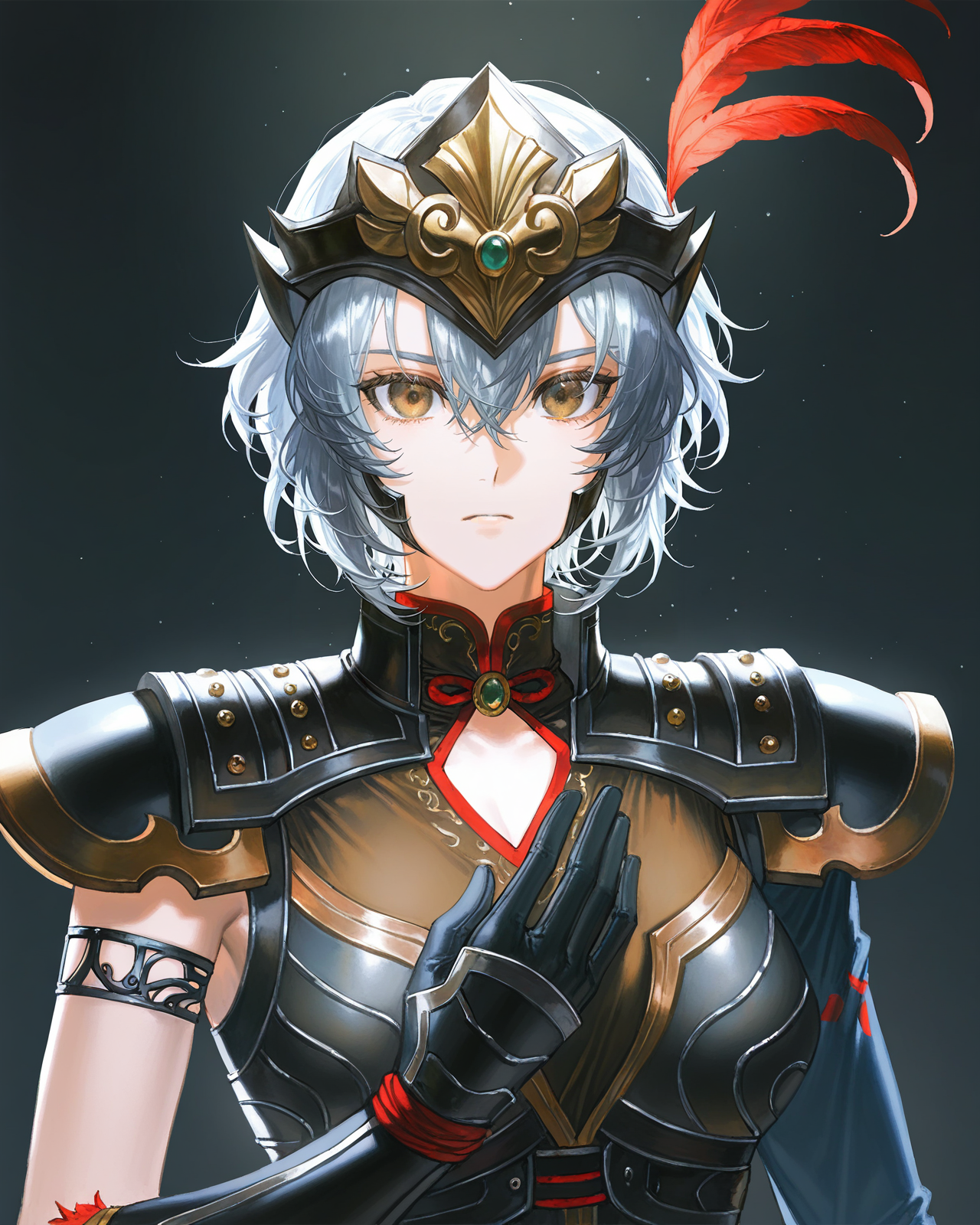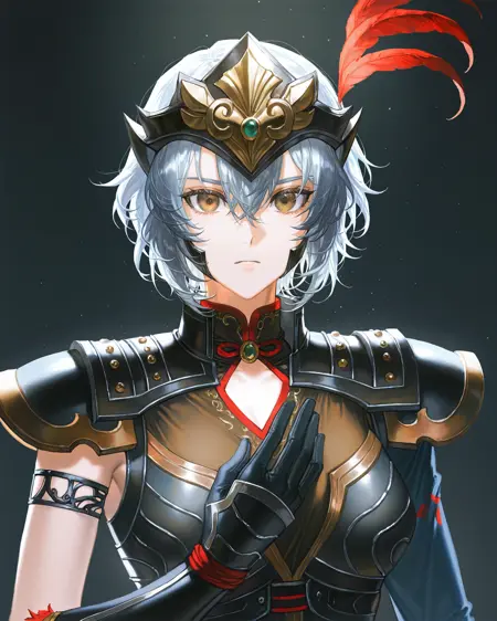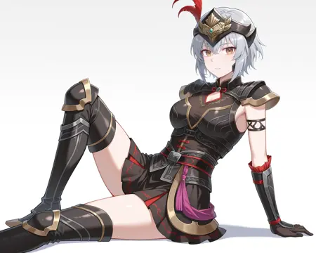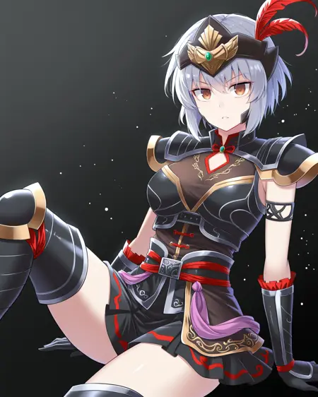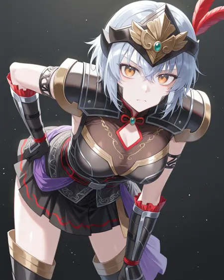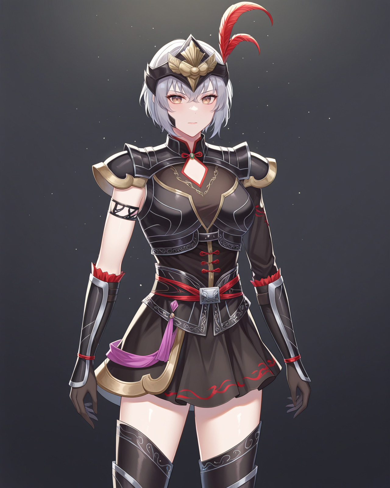 <lora:LuLingqiDW8_Illustrious:1>, Lu Lingqi, 灰发, 短发, 棕色眼睛, 中等胸部, 头盔, 装甲连衣裙, 肩甲, 手套, 黑色短裙, 大腿长靴,