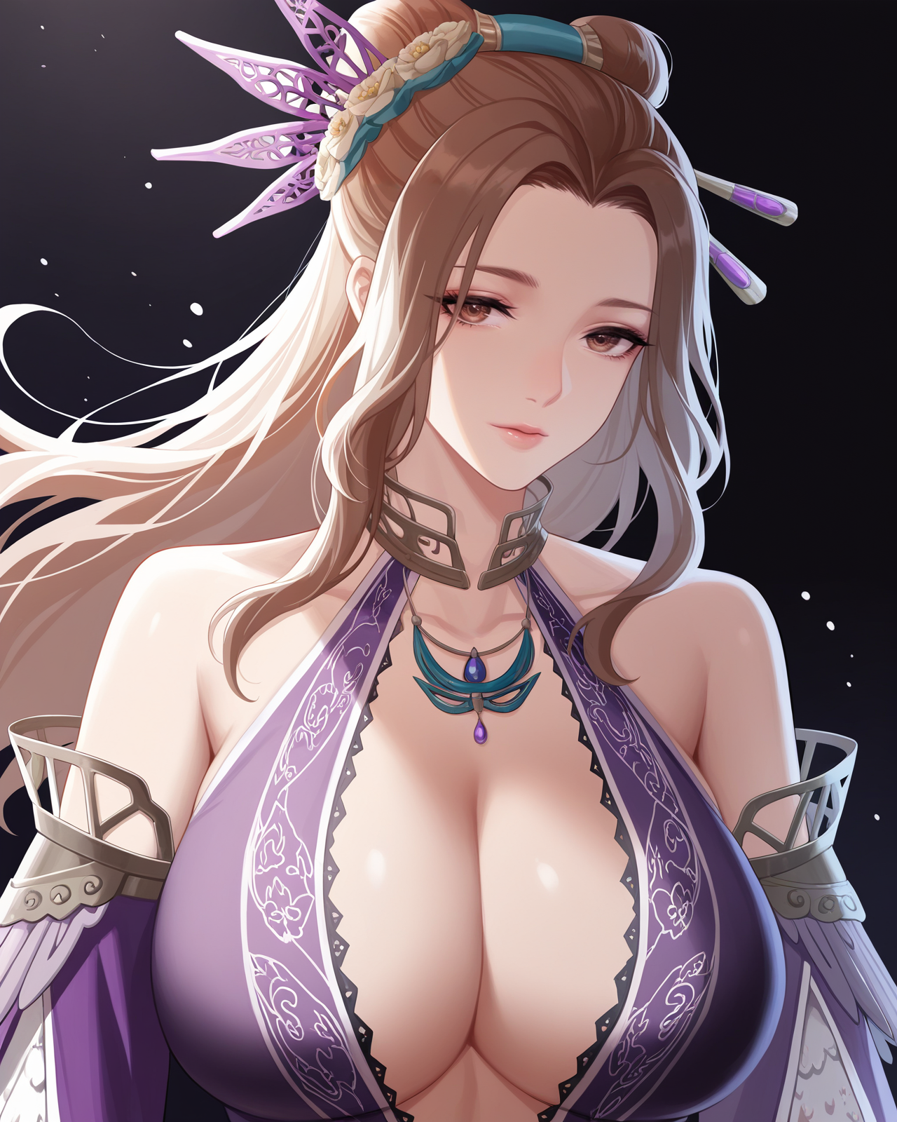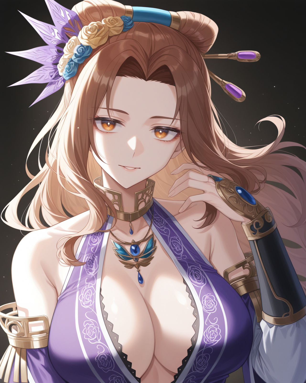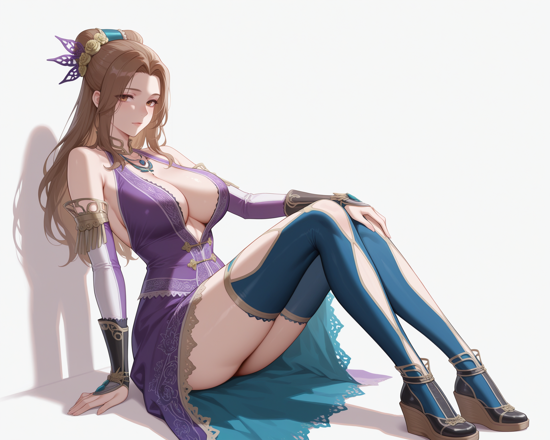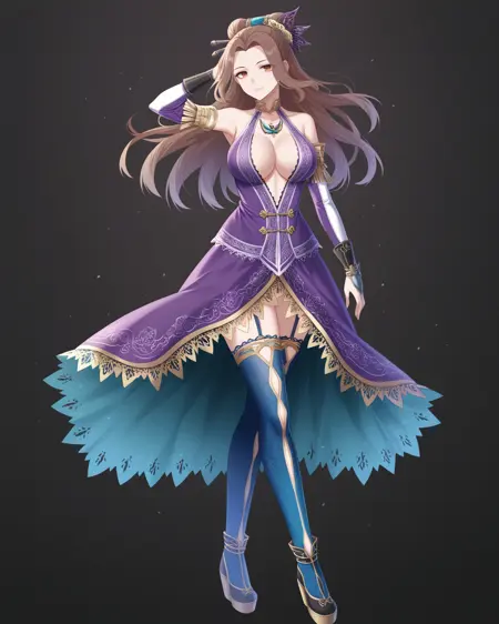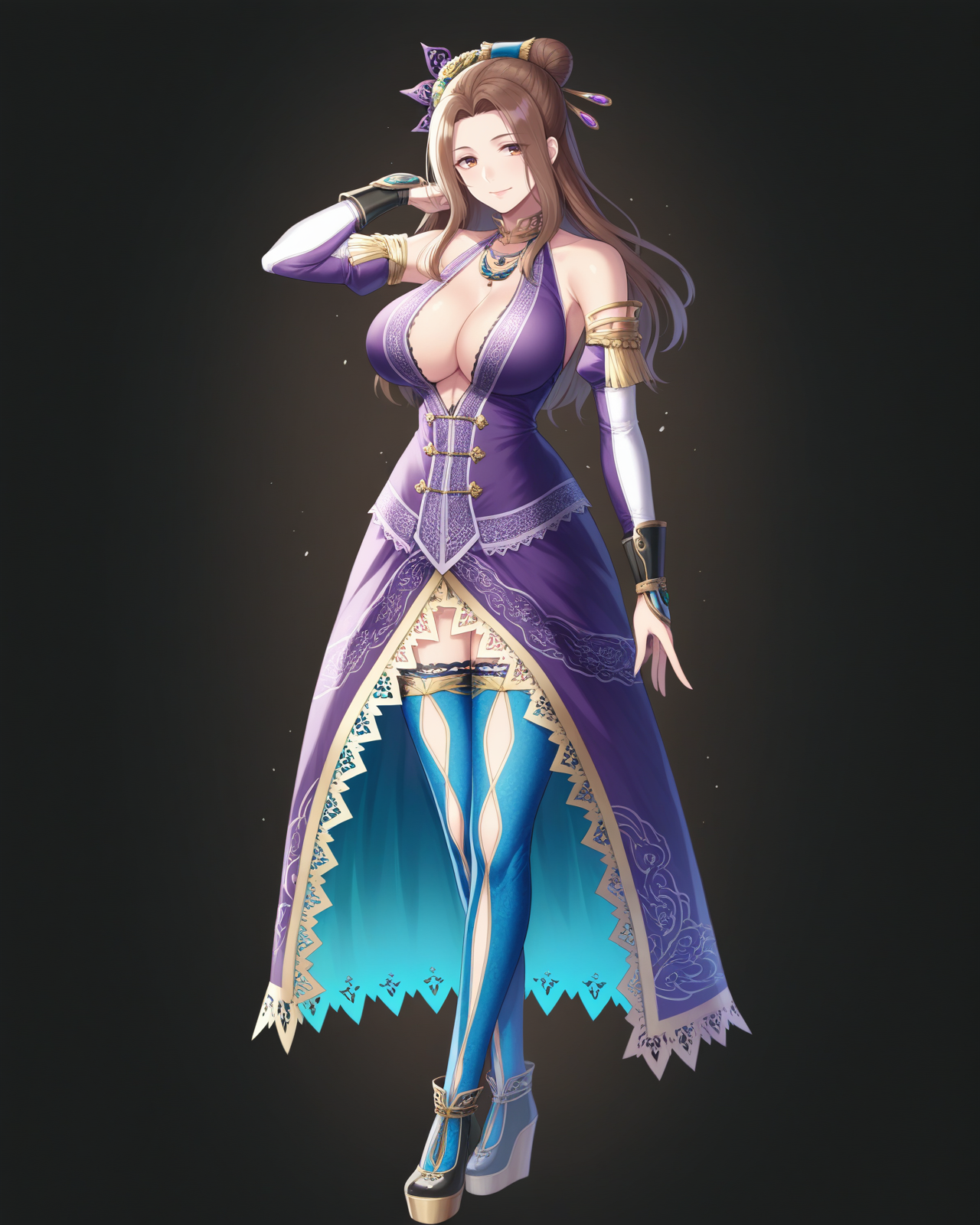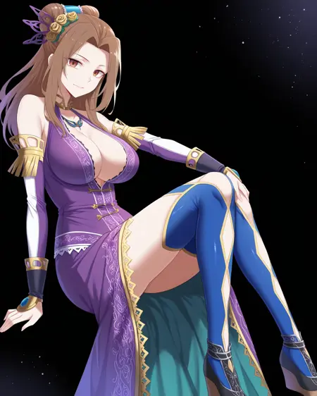 <lora:ZhangChunhua_Illustrious:1>, Zhang Chunhua, 长发, 棕色头发, 单发髻, 发饰, 棕色眼睛, 大胸部, 紫色裙子, 暴露的胸部, 脱袖, 蓝色腿部服饰, 黑色鞋子, 楔形高跟鞋,
