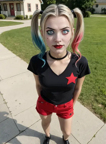 Use triggers: harley quinn, pale white skin, two-tone hair (pink and blue streaks)