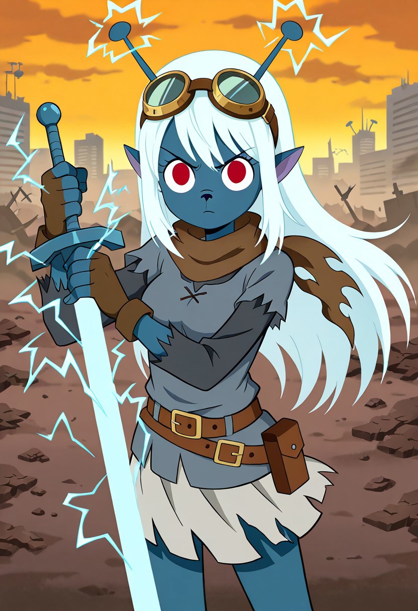 1girl, solo, furry, Emojialien_SJ, steel blue skin, red eyes, light cyan hair, long straight hair, pointy ears, small black nose, two steel blue antennae with rounded tips on her head