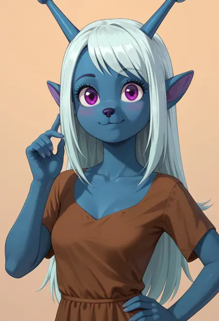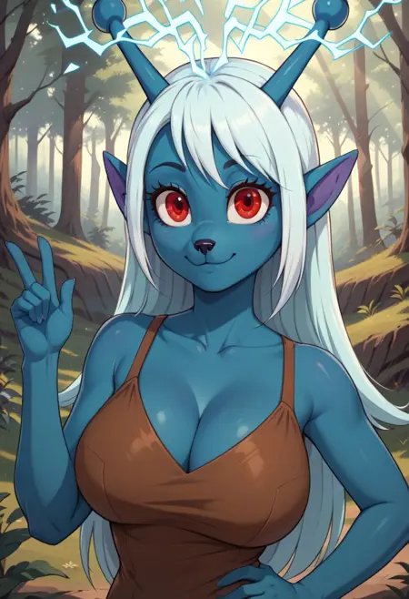 1girl, solo, furry, Emojialien_SJ, steel blue skin, red eyes, light cyan hair, long straight hair, pointy ears, small black nose, two steel blue antennae with rounded tips on her head