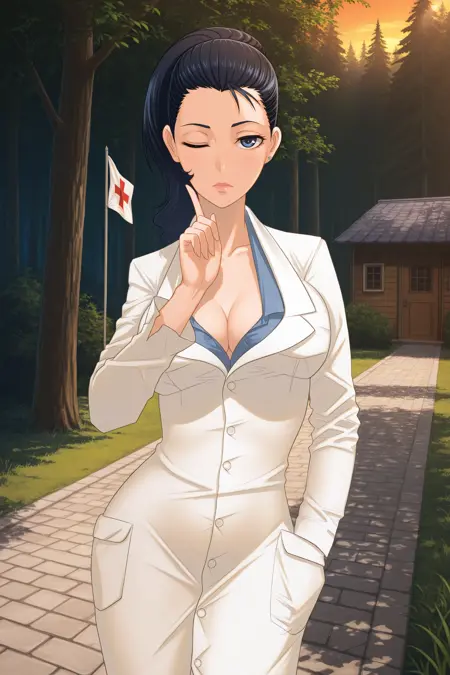 白大褂:violalabcoat,耳钉,长袖,纽扣,有领衬衫,敞开的衬衫,紧身衣物,扣上的白大褂,黑色连裤袜,鞋子,黑色鞋履,高跟鞋
