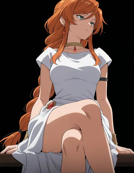 복장: 흰색 드레스, 짧은 소매, 한쪽 팔찌, 팔찌, 목걸이, 샌들