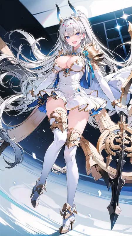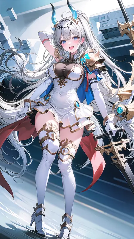 -->提示词:suffrenlibre, horns, white dress, armor, white thighhighs, large breasts, white gloves, smile, blush, open mouth,