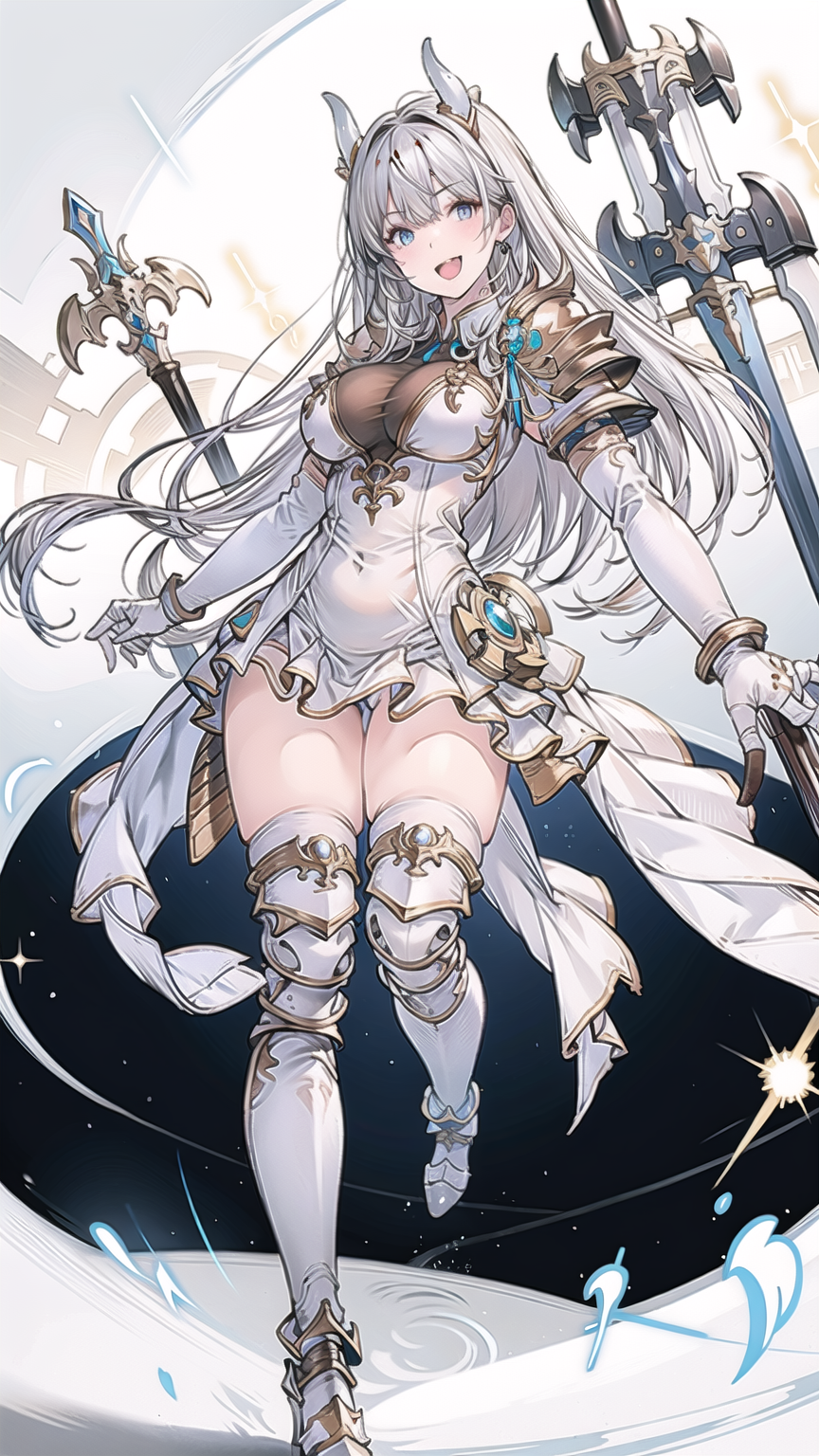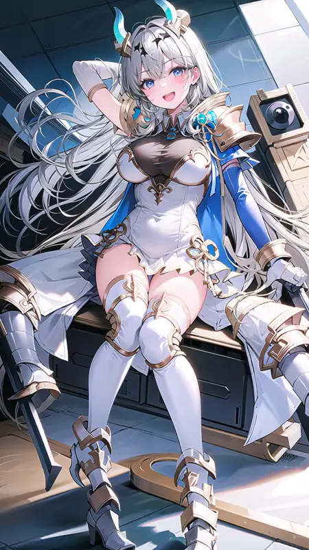 -->提示:suffrenlibre, horns, white dress, armor, white thighhighs, large breasts, white gloves, smile, blush, open mouth,