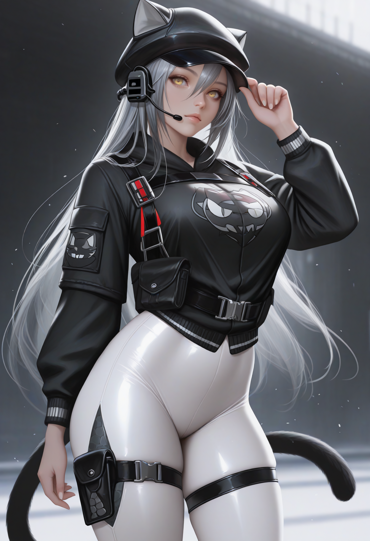 城市天际线: schw4rzsky, 猫尾, 灰发, 眼间头发, 黑色头饰, 出租车帽, 猫帽, 耳机, 黄色眼睛, 黑色夹克, 印花夹克, 长袖, 胸部束带, 白色裤子, 紧身裤, 大腿绑带, 黑色鞋履