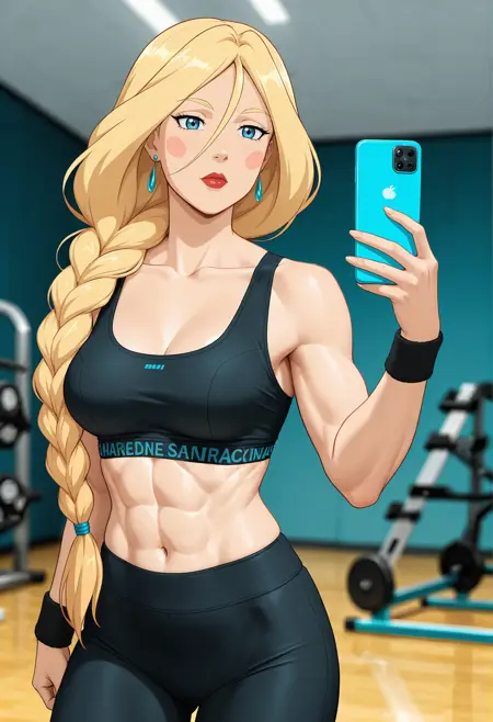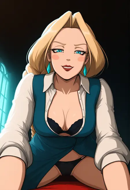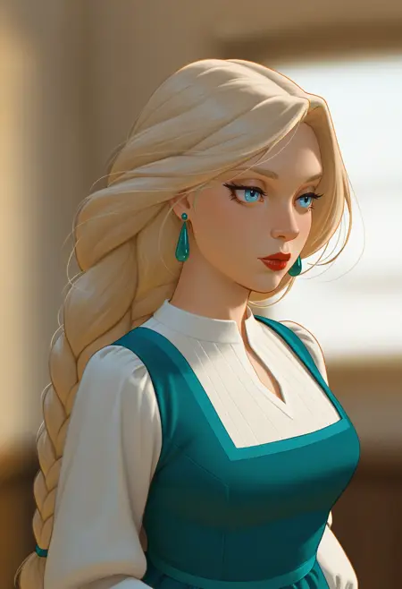 Main Tags : nastasya, 1girl, blonde hair, solo, earrings, long hair, jewelry, braid, apron, parody, blue eyes, indoors, single braid, hair over shoulder, freckles, long sleeves.