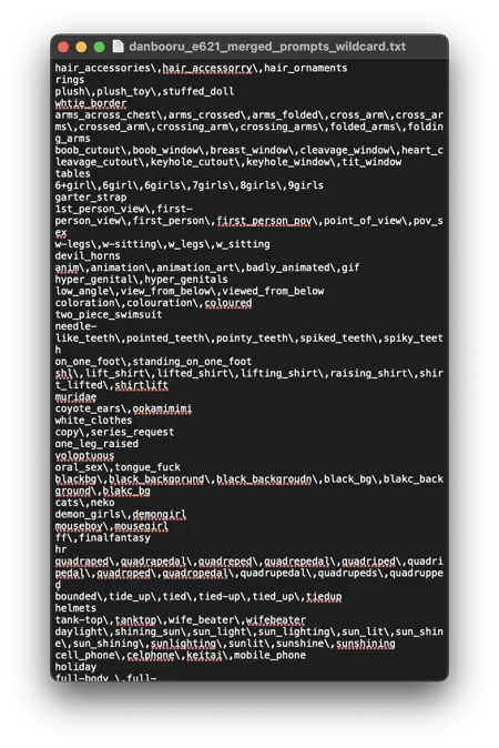 e621_danbooru_wildcards.zip – A1111 및 ComfyUI에서 동적 프롬프트 워크플로우에 즉시 사용 가능한 와일드카드 파일 압축 파일입니다.