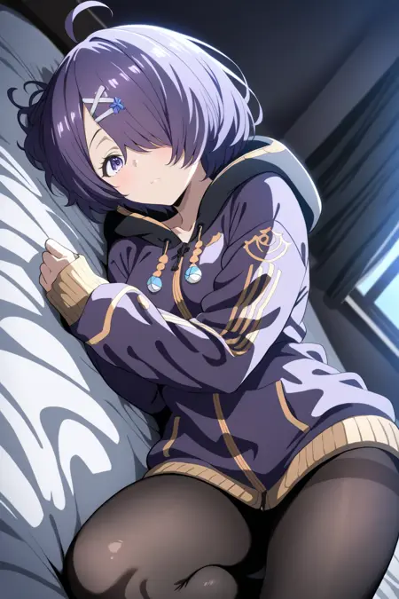 hair ornament, hair over one eye, purple hoodie, black pantyhose
