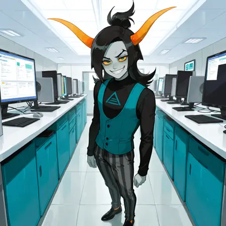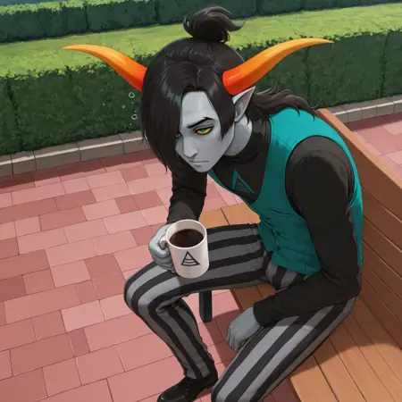 보조 태그: homestuck troll, 회색 피부, 색깔이 있는 피부, 노랑 공막, 색깔이 있는 공막, 검은 머리, 긴 머리, 작은 파마, 한쪽 눈 위의 머리, 뿔, 주황색 뿔