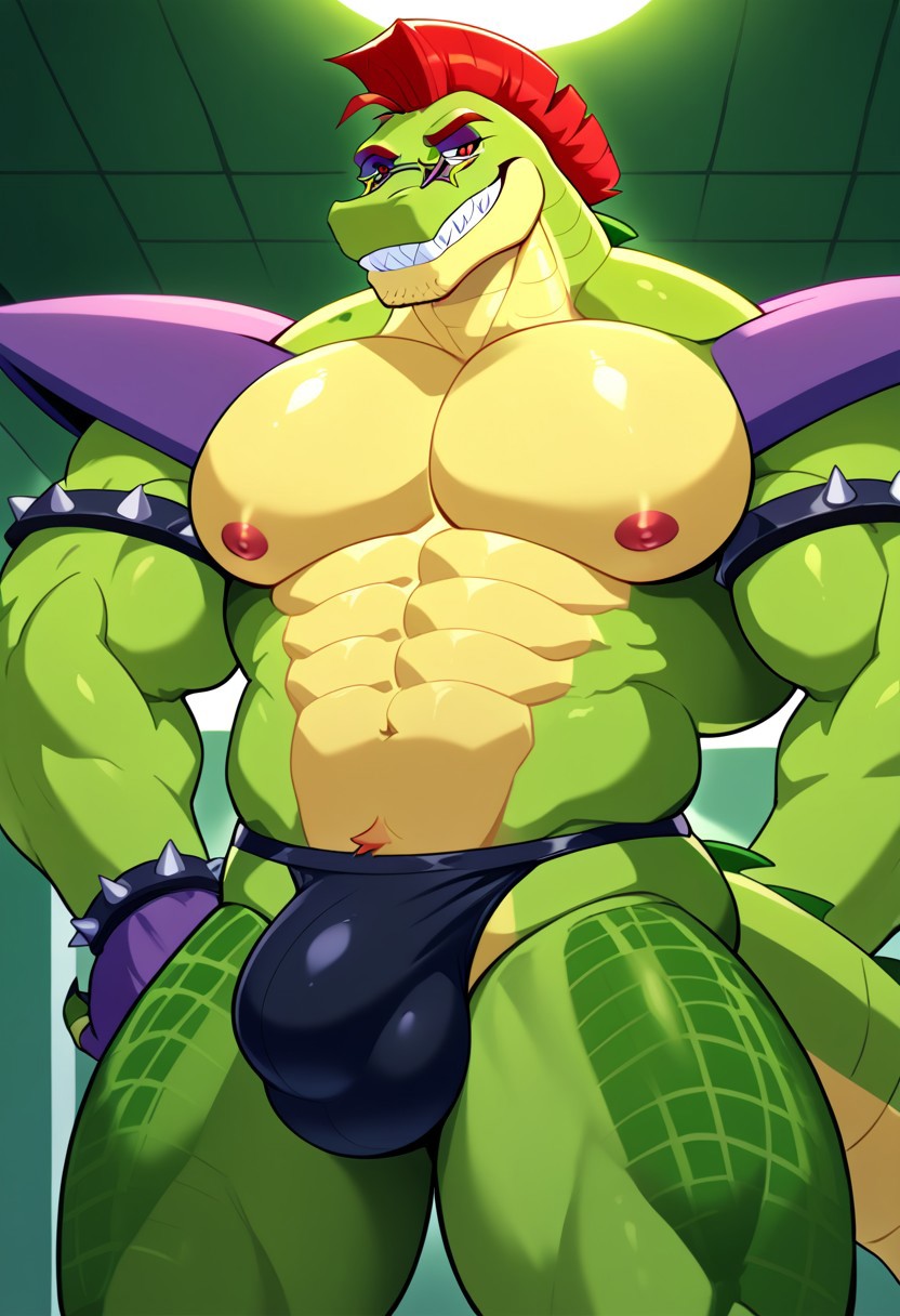 Anthro,alligator,montgomery gator,muscular male,red hair,mohawk,red eyes,green body,tail
