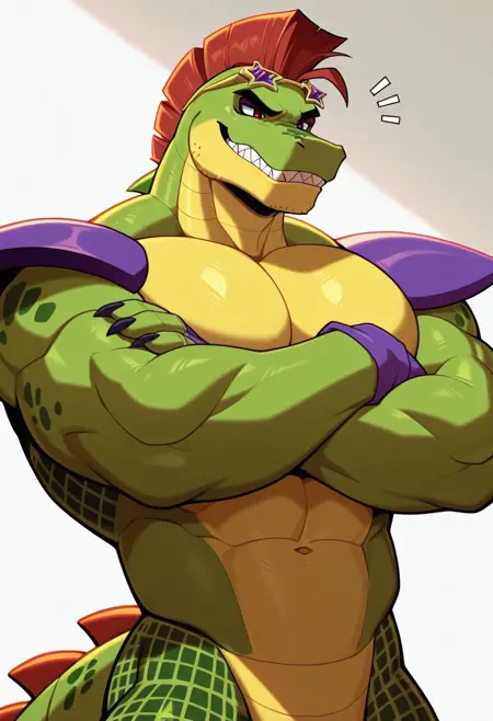 Anthro,alligator,montgomery gator,green body,muscular male,white sclera,red eyes