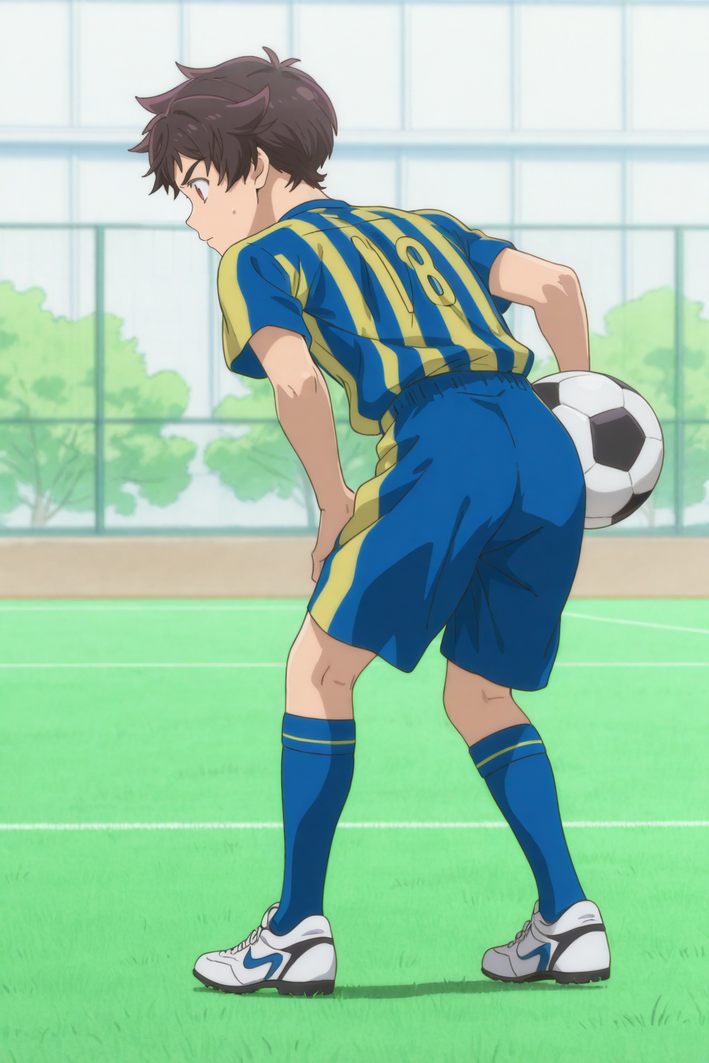축구 유니폼, 줄무늬 셔츠, 파란 반바지, 파란 양말, 흰 스니커즈