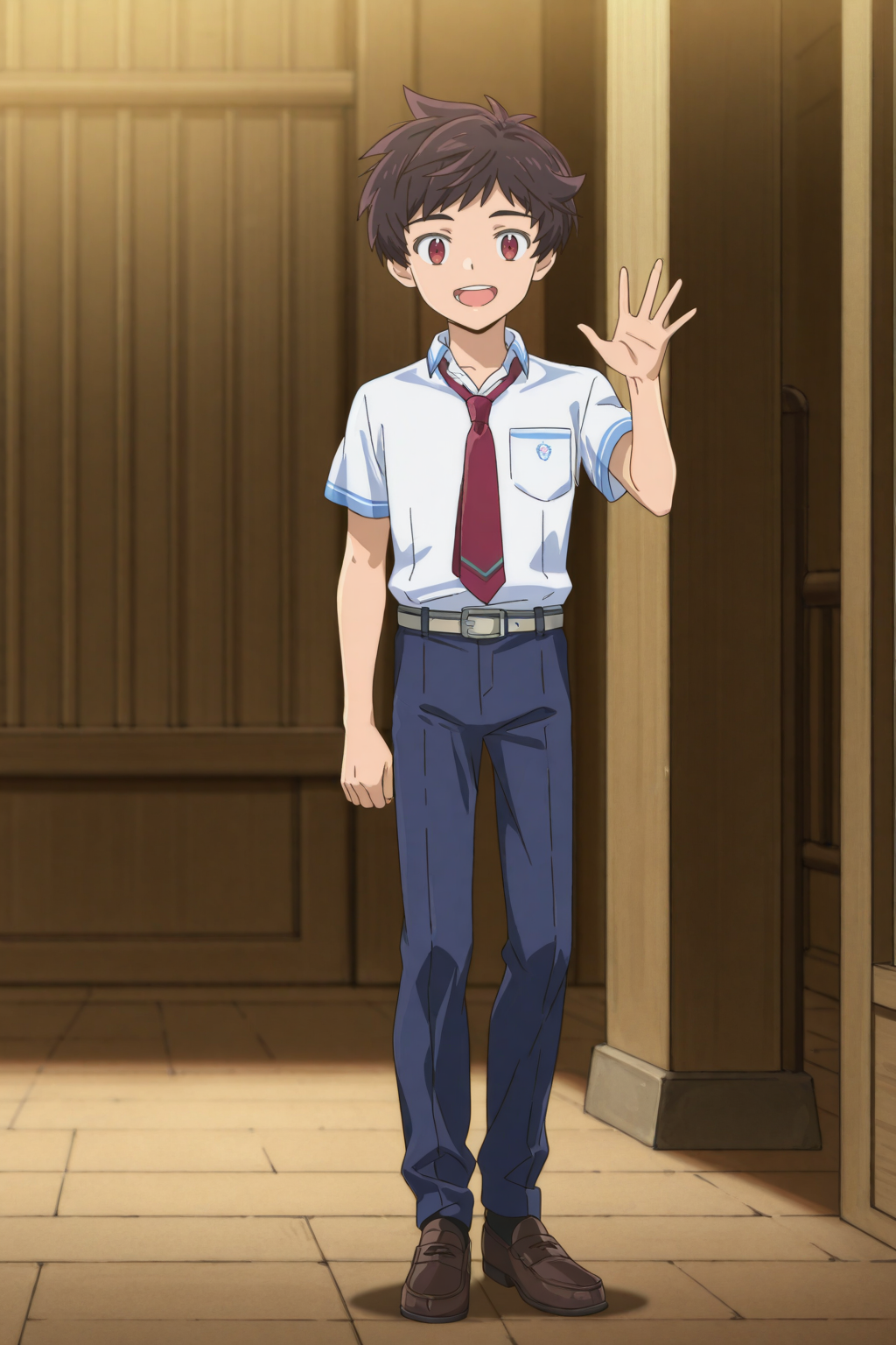 학교 유니폼, 흰 셔츠, 빨간 넥타이, 파란 바지, 갈색 신발