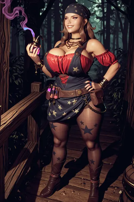 トリガー:herba、長い髪、アイシャドー、ブレスレット、裸の肩、黒い爪、ネックレス、チョーカー、赤い目、イヤリング、バンダナ、星のプリント、指輪、トップ、エプロン、サスペンダー、スカート、タイツ、ベルト、ベルトポーチ、チェーン