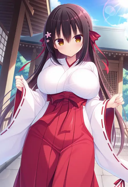 Clothing: white kimono, red hakama skirt, long sleeves, ribbon-trimmed sleeves, wide sleeves,