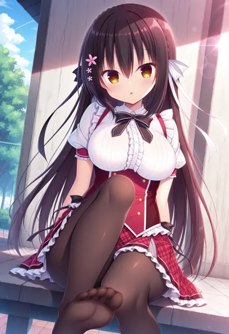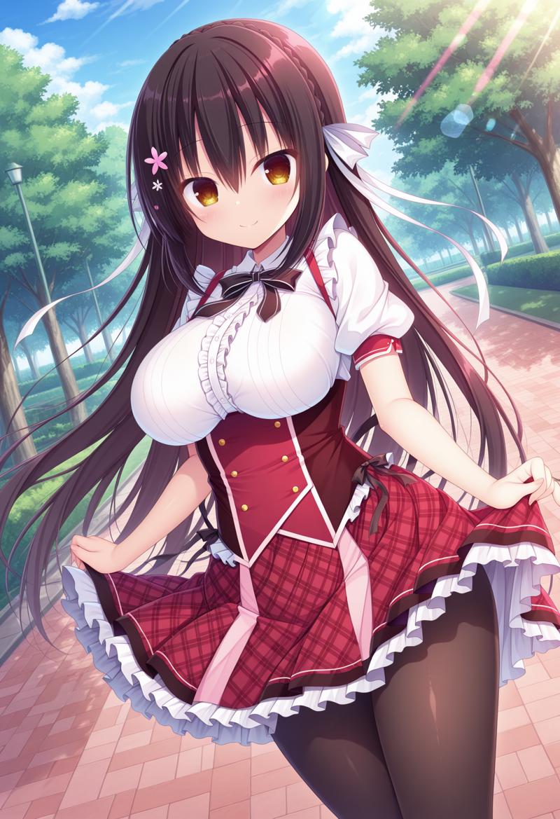 Clothing: dress shirt, center frills, bowtie, short puffy sleeves, red underbust, plaid skirt, black pantyhose, black ribbon,