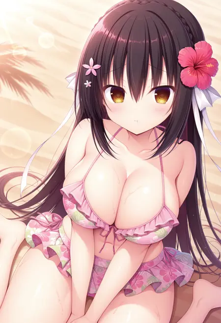 Trigger words: c-kaidou, long hair, black hair, brown eyes, braid, hair ribbon, hair flower, white ribbon, hibiscus,