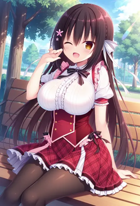 トリガー語: c-kaidou, 長い髪, 黒髪, 編み髪, 茶色の目, 髪の花, 髪リボン, 赤いリボン