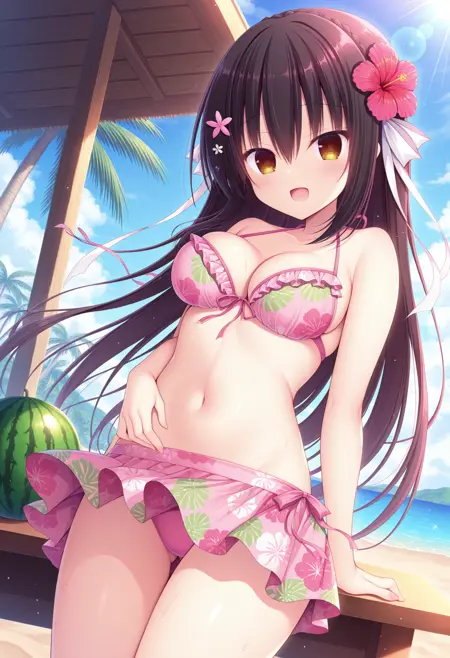 衣装: ピンクのビキニ、ピンクのビキニスカート、緑のフラワープリント、ピンクのリボン
